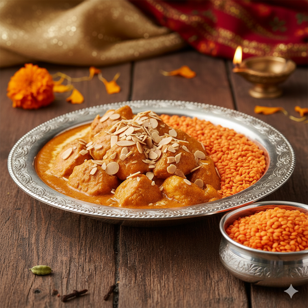 Poulet douceur des Indes: Emincés de poulet délicatement mijotés dans un mélange d’épices indiennes parfumées, sublimés par une sauce onctueuse au lait de coco. Finition d’amandes effilées légèrement torréfiées pour une touche croquante et élégante. Servi avec des lentilles corail fondantes aux notes chaleureuses. Un plat raffiné, parfumé et tout en douceur, qui invite au voyage sans jamais brusquer le palais. 🌿🥥 🌞🌾