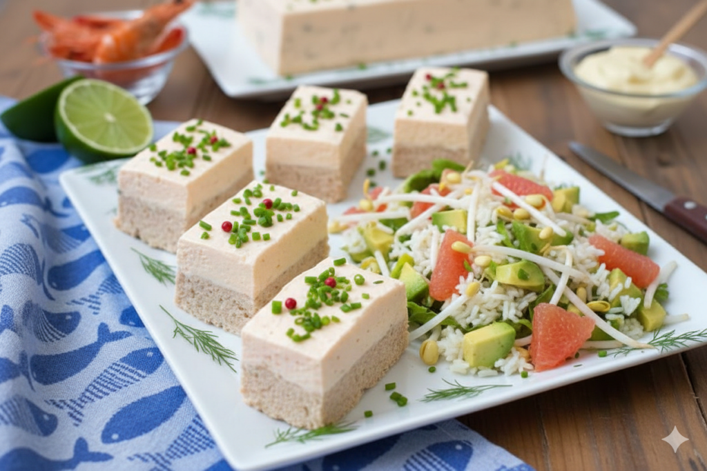 Bûchettes de poisson & salade exotique fraîcheur : Des bûchettes de poisson qui sentent bon la mer, posées sur un arc-en-ciel exotique : riz moelleux, avocat tout doux, pamplemousse qui claque, pousses de soja qui croquent. C’est frais, c’est coloré, c’est léger… et ça se mange froid, sans chichi.